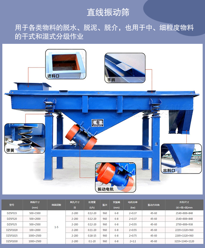 直線振動篩篩箱的運動軌跡為直線或接近直線,它有兩個軸,所以又稱雙軸振動篩。直線振動篩水平或傾斜安裝,這類振動篩結構緊湊,運行平穩,被廣泛用于各類物料的脫水、脫泥、脫介,也用于中、細粒度物料的干式和濕式分級作業。我廠生產的直線振動篩種HZSF型號就是直線振動篩代表性的產品。