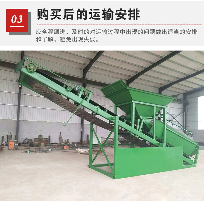 篩沙機(jī)在采購(gòu)?fù)戤吅?,廠家會(huì)在設(shè)備完成后進(jìn)行運(yùn)輸發(fā)貨,此時(shí),用戶應(yīng)全程跟進(jìn),及時(shí)的對(duì)運(yùn)輸過(guò)程中出現(xiàn)的問(wèn)題做出適當(dāng)?shù)陌才藕土私猓苊鈴S家出現(xiàn)失誤,出現(xiàn)小配件漏發(fā)等問(wèn)題。