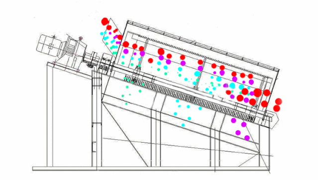 電機(jī)通過(guò)三角帶使激振器的偏心塊高速旋轉(zhuǎn),運(yùn)行的偏心塊產(chǎn)生很大的離心力,刺激篩箱產(chǎn)生一定幅度的圓周運(yùn)動(dòng),篩上的物料在傾斜的篩面上受到篩箱傳遞的沖量,產(chǎn)生連續(xù)的拋擲運(yùn)動(dòng),物料與篩面相遇的過(guò)程使小于篩孔的顆粒通過(guò)篩網(wǎng),從而實(shí)現(xiàn)分級(jí)。
