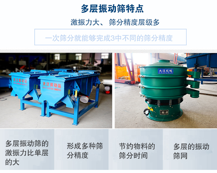 多層振動篩可用于粉末,顆粒,液體物料篩分和分級,篩網有2-6層可選,可將物料篩分成3-6種不同規格粒度,分多層直線振動篩和多層旋振篩,材質有碳鋼,不銹鋼,塑料可選。
