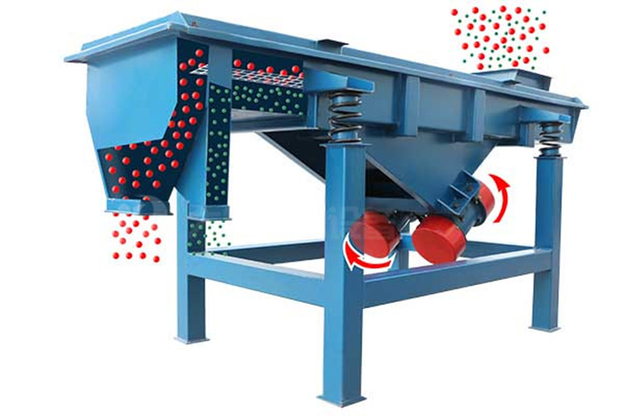 直線型振動篩兩電機軸相對篩面有一傾角,在激振力和物料自重力的合力作用下,物料在篩面上被拋起跳躍式向前作直線運動,從而 達到對物料進行篩選和分級的目的。可用于流水線中實現自動化作業。