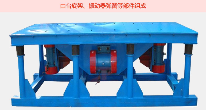 混凝土振動臺主要由臺底架、振動器彈簧等部件組成,臺面與底架均用鋼板和型鋼焊接而成,振動臺是用電動機 加一對相同的偏心輪組成。并通過一對吊架聯軸器安裝在臺面(反面)中心位置,起著振實過程中平穩、垂直方向的作用。