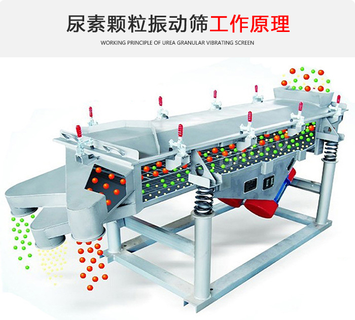 尿素顆粒振動篩有:DZSF-515、DZSF-520、DZSF-1020、DZSF-1025、DZSF-1030、DZSF-1035、DZSF-1540等長、寬、高不同的機型。